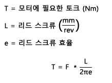 아래의 공식은 필요한 모터 회전 토크를 찾고 힘, 리드 및 효율을 제공하는 데 사용됩니다.